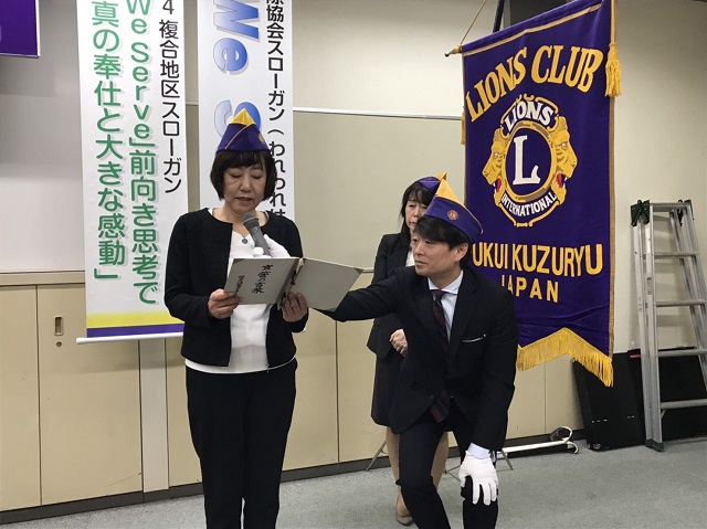 山本公美ライオンの入会式が行われました。 本年度二人目の新入会員入会式、また前回に引き続き 女性会員の入会ということで国際協会が推進する女性会員増加 に沿う増強活動に繋げることができました。